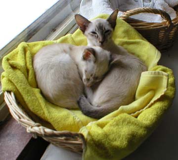 Two litters: One born January 4, to Desiree (seal-point) three boys, a seal-point at left and bottom here, a seal-lynx-point (top in 1st picture), and another lynx-point probably blue at right. The other litter born Feb 2, three boys and one girl scattered bottom and right in these pictures. They are too young to tell color for sure, but at least some will be seal-lynx points like their mother Desdemona.