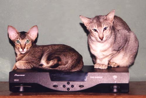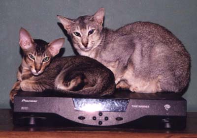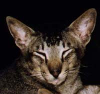 Now available! Grand Champion Synergy Mylar. ebony silver ticked tabby born 7/15/99. Mylar is a sweet boy, and a goofball, if a bit of a wimp. He is a beautiful boy, recently neutered. He would be a good cat to show as an alter, and would be very happy just to be a lap cat. He loves to play, He is a very "extreme" Oriental, long, tall, and slender. He would do well with other young and lively cats. | ![]() |